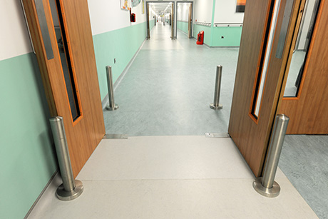 Severe duty, stainless steel posts designed to protect architectural features, corners and doors by deflecting wheeled traffic away.