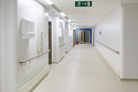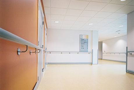 40mm circular handrail featuring textured Acrovyn PVC-Free cover, providing comfortable mobility support in corridors.